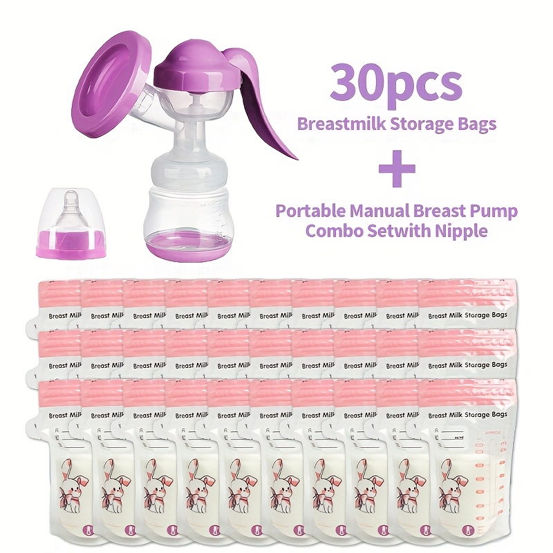Portable Manual Breast Pump with 30 200ml Milk Storage Bags - Dual Suction, Anti-Backflow & Petal Massage Cover - Soft, Hygienic Manual Pump Suitable for Four Colors | for Breastfeeding -the, Travel, & Year